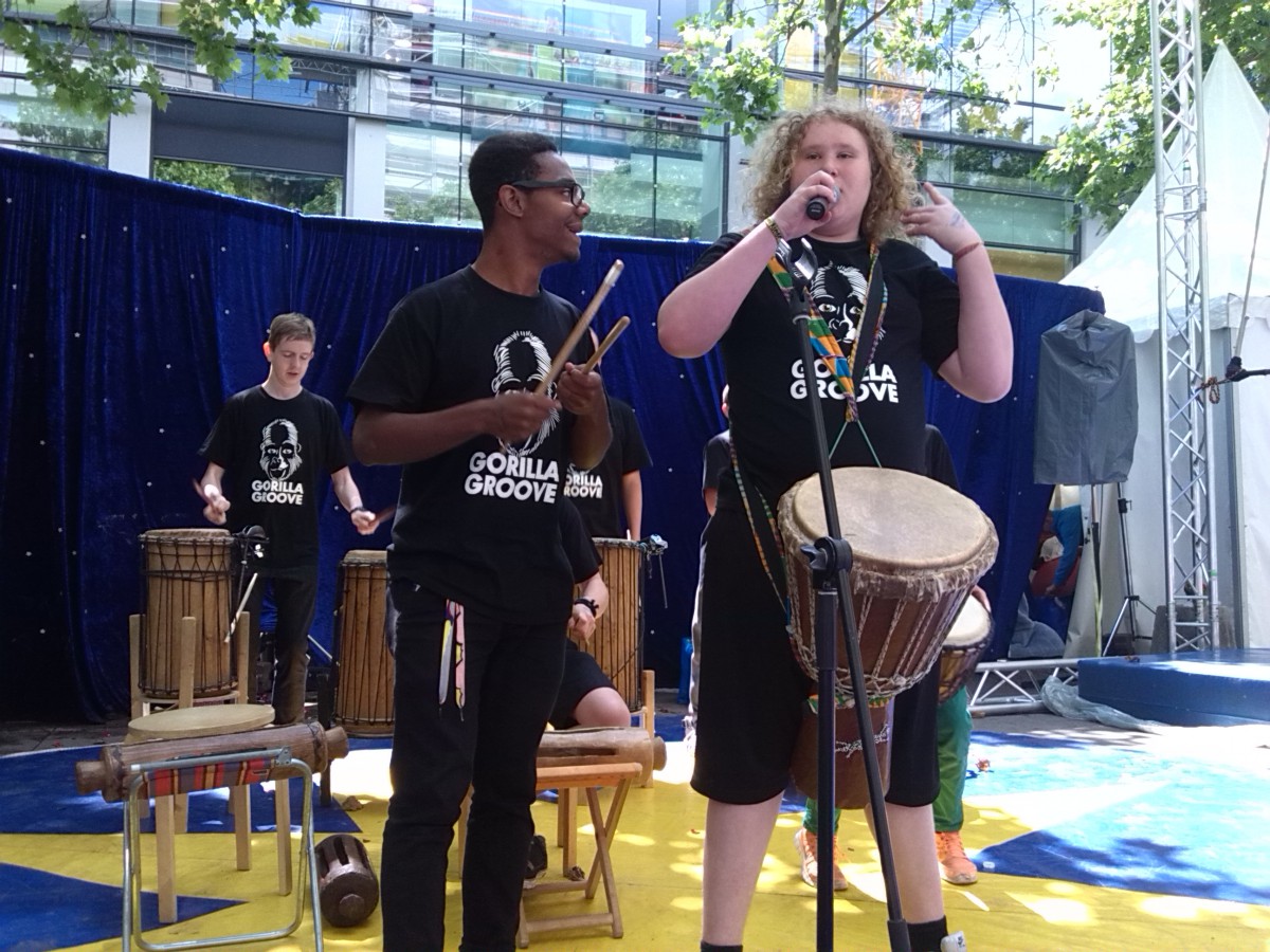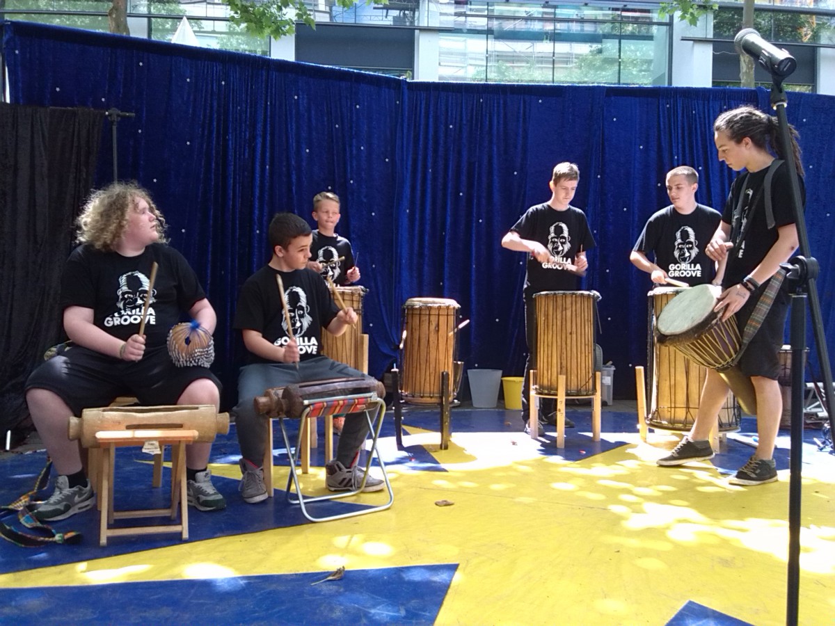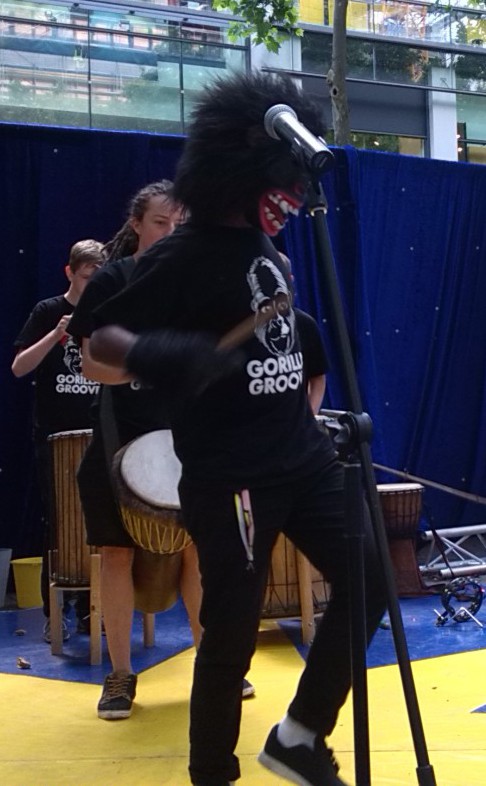 So langsam stieg dann aber auch die Spannung unter den Zuschauern, denn ab 14.00 Uhr stand der erste Programmpunkt „Gorilla Groove“ des Trommelpalastes Mannheim auf dem Veranstaltungsplan. Ein Clown betrat kurz nach 14.00 Uhr die blau eingehüllte Sternenbühne, um die Menschen zum Klatschen und Lachen zu animieren, bevor dann zu dem tosenden