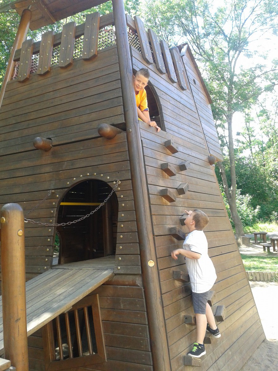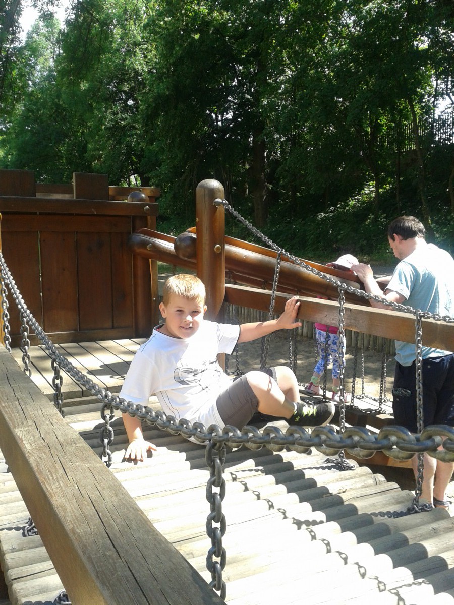 Auf dem Burgspielplatz angekommen, stürzten wir uns sofort auf die Gerätschaften. Besonders angetan hat uns hier die lange Seilrutschbahn, die einen „Mordszacken draufhatte“, aber auch das burgähnliche Klettergerüst mit seiner Zugbrücke.