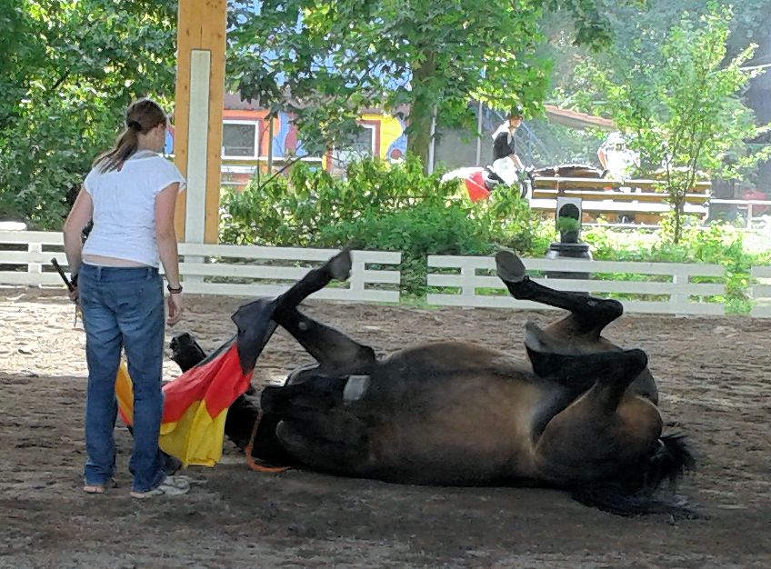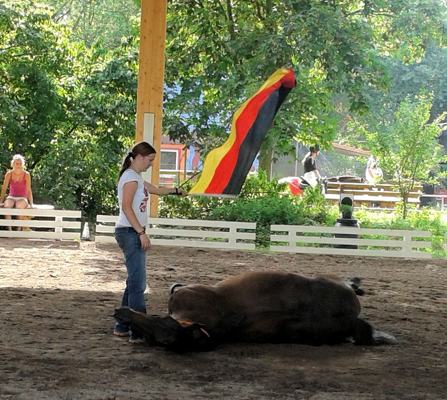 Nach jeder bravourös absolvierten Aufgabe machte die Stute einen majestätisch verbeugenden Knicks, um sich für den großen Applaus der zahlreichen Zuschauer zu bedanken. Zum Finale der Vorführung durfte sich Ebony dann noch auf dem Rücken räkeln wie ein Schmusekätzchen und dabei den Schwingen der Deutschlandfahne folgen, was nicht nur unglaublich amüsant aussah, sondern auch wieder mit sehr viel Applaus des Publikums gewürdigt wurde.