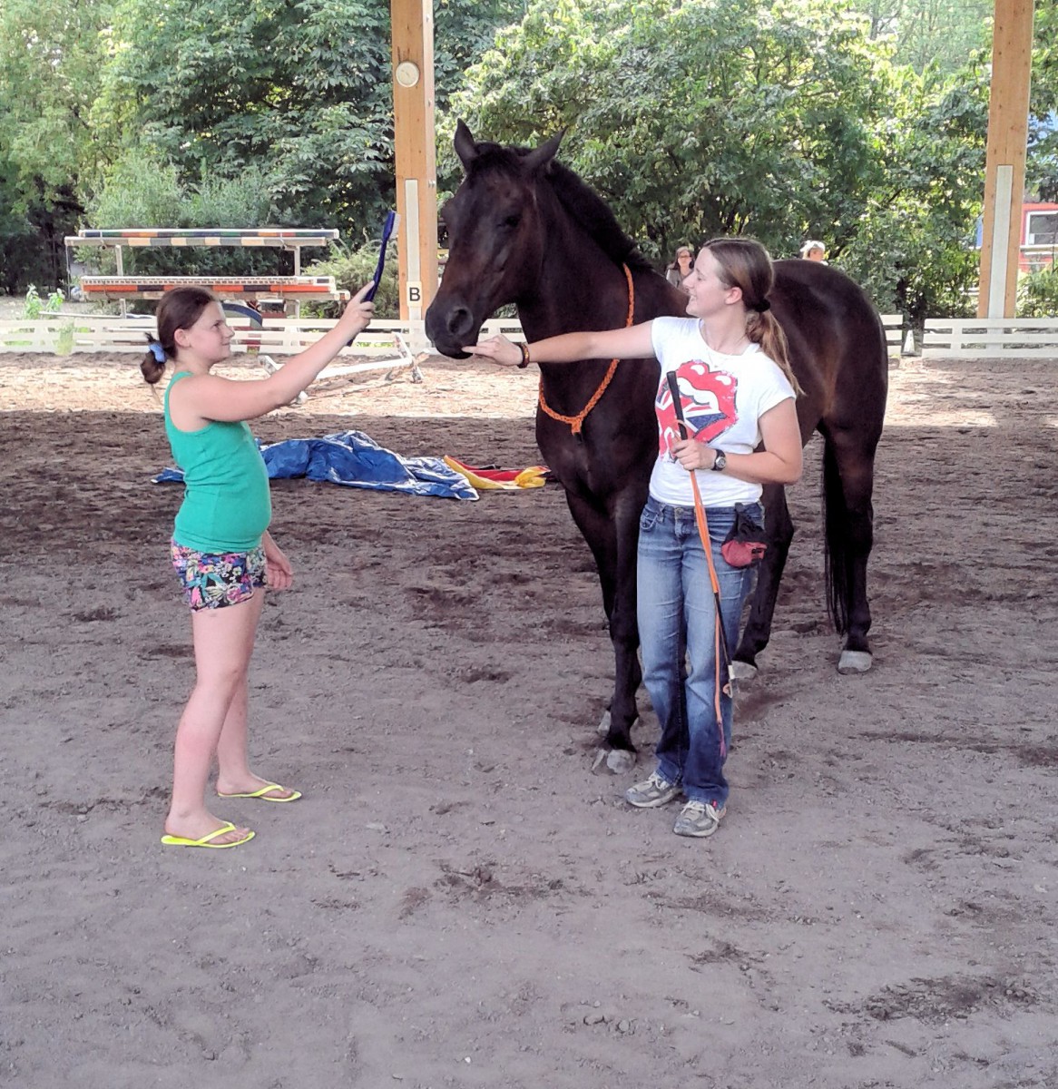 Nach so viel toller Unterhaltung, folgte nun der erste ganz große Höhepunkt des Tages, denn die Jugendfarm präsentierte mit Anja Rudolph und ihrer 16-jährigen Stute Ebony vom Schießhof aus Lampertheim einmal ein ganz anderes Gespann. Zu unserer großen Überraschung ging es bei dieser Vorführung nicht ums Reiten, sondern ausschließlich um Bodenarbeit und Gehorsamsübungen. Hierbei agierte die erfahrene Reiterin auch ohne Trense und Halfter, und leitete ihr Pferd ausschließlich mit ihren Bewegungen und Worten durch den Parcours. Zu unserer großen Verblüffung absolvierte das Pferd alle geforderten Aufgaben, angefangen von dem Nebeneinanderherlaufen, bis hin zu Slalomläufen und dem Cavaletti (dem Überspringen eines kleinen Hindernisses).