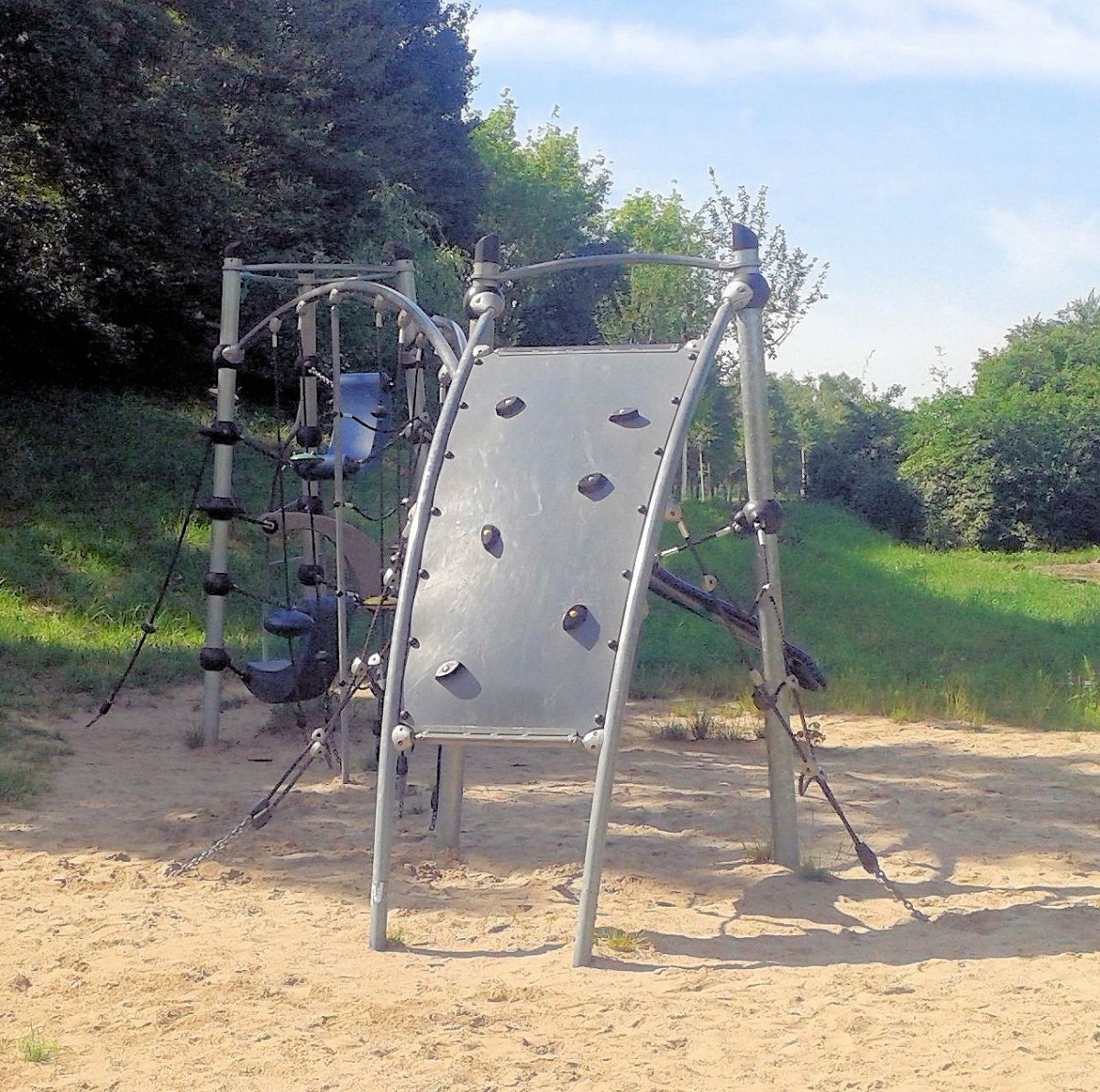 dass dieses Gerüst mit an Sicherheit grenzender Wahrscheinlichkeit falsch geliefert wurde, weil es eigentlich in den Zoo gehört, denn dieses Klettergerüst ist allerhöchstens etwas für „de Aff'“ (!) Klettern können Kinder und Jugendliche darauf nämlich nicht wirklich, oder, wenn überhaupt, dann nur mit Hilfe einer Leiter. Mehr dazu ab Mitte September in unserem Videoblock. Das Gerüst ist zudem extrem verletzungsgefährdend, da die Winkel (siehe Bild rechts) überirdisch verlegt sind, sodass sich Kinder beim Abrutschen unter Umständen sehr schwere Schürfwunden zuziehen können. Dass der TÜF ein solches Gerüst überhaupt zulässt ist uns unbegreiflich!