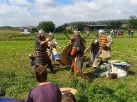 Noch immer begeistert von den vielen tollen Eindrücken, die wir vor den großen Ferien beim Mittelalterlichen Sommerfest im Histotainment Park Adventon in Osterburken mit nach Hause nehmen durften, machten wir uns erneut auf die kleine Reise in das Dreiländereck, um uns das diesjährige Wikingerfest anzuschauen. Für 5 Taler Eintritt – sprich zwei Mal „Berg-und-Tal-Bahn-fahren“ auf der Kerwe – hatten wir anstatt nur fünf Minuten über fünfstundenlang jede Menge Spaß, denn wir durften sowohl das Leben und die Gebräuche der Wikinger kennenlernen, als auch an den vielen Aktionen der Schausteller teilnehmen. Mit Spannung verfolgten wir dort ebenfalls die unterhaltsamen und „blutigen“ Wikingerschlachten zwischen der Krabbelgruppe und den Kleinen Wölfchen, zu deren ständiger Auferstehung eigens ein Priester anreiste, der die „toten“ Krieger nach den Kämpfen zu ihrer Vergebung hin und wieder auch mit etwas zu viel Wasser segnete.